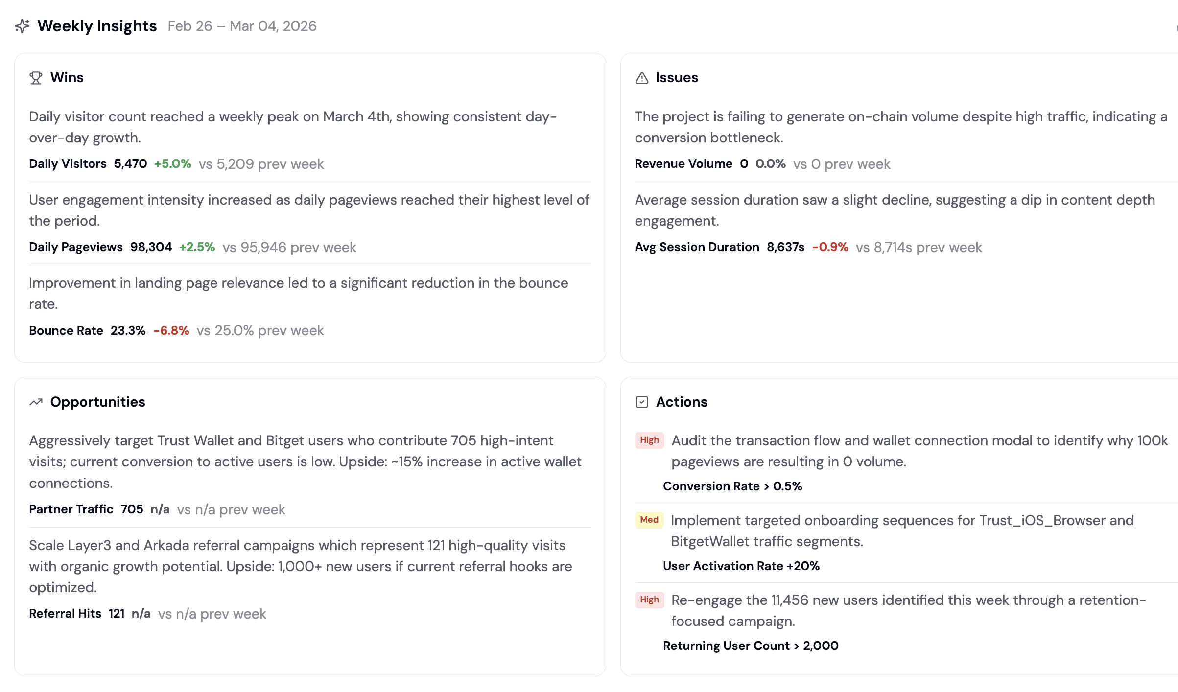 "Show me the conversion funnel from wallet connection to first transaction." to identify drop-off points.