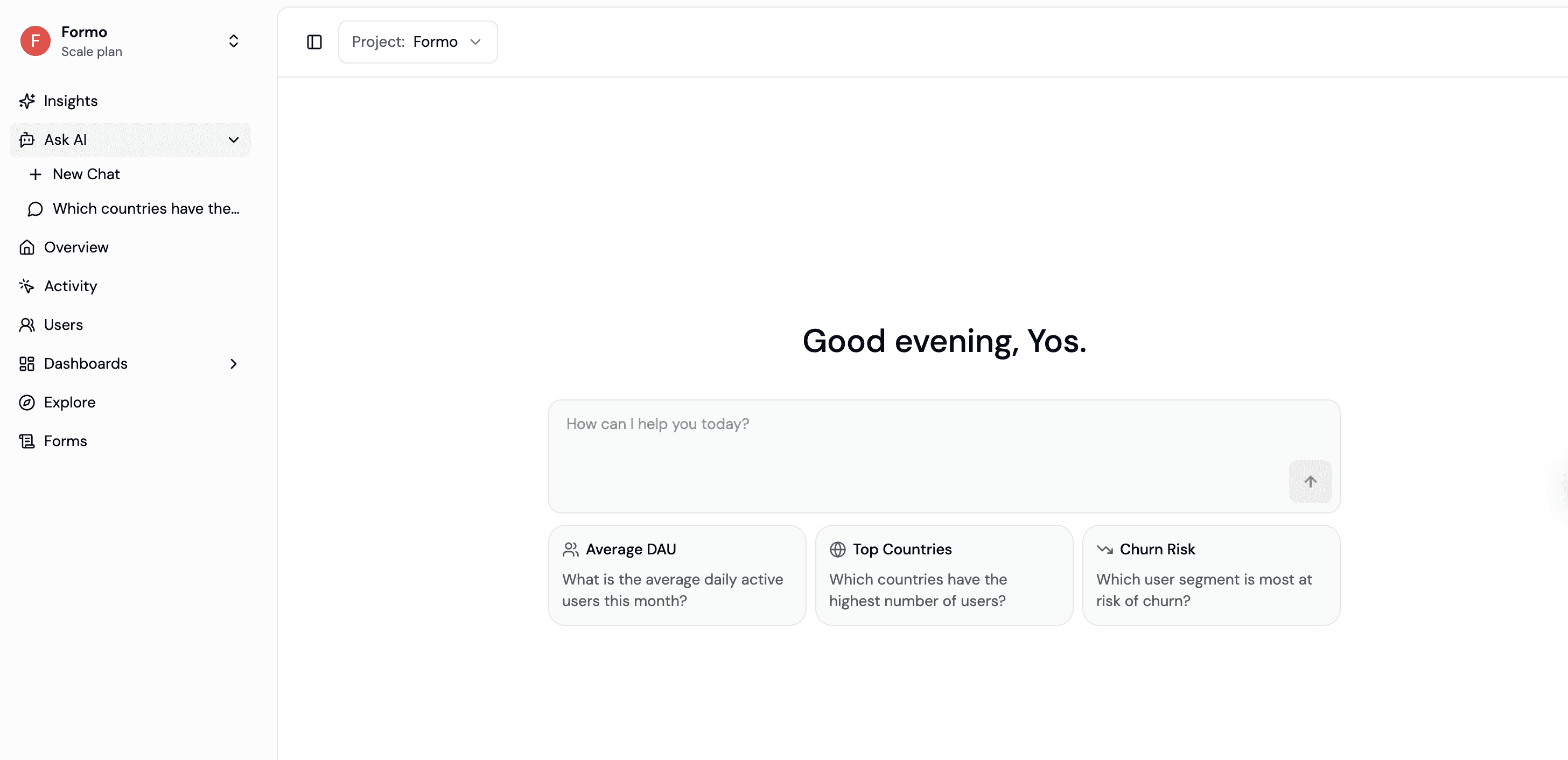 Ask AI is a natural language analytics assistant embedded into every Formo dashboard. Instead of constructing SQL queries or clicking through filter menus, you type a question the way you would ask a colleague sitting next to you.