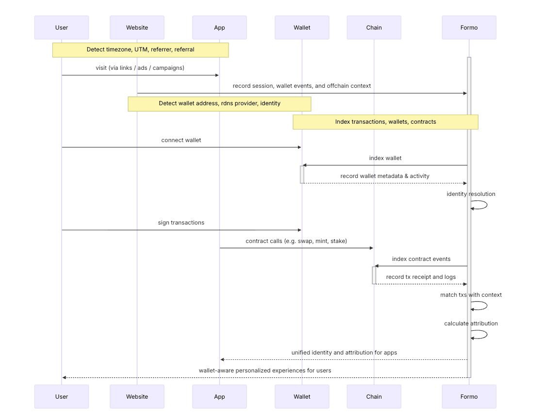 The basic case (one person, one primary wallet) is handled well by crypto-native tools. Formo, for example, links a wallet address to all offchain session data (referrer, UTM, page views) at the moment of wallet connection, creating a unified user profile that persists across sessions and devices. This wallet-level identity resolution is automatic and doesn't require invasive tracking or device fingerprinting.