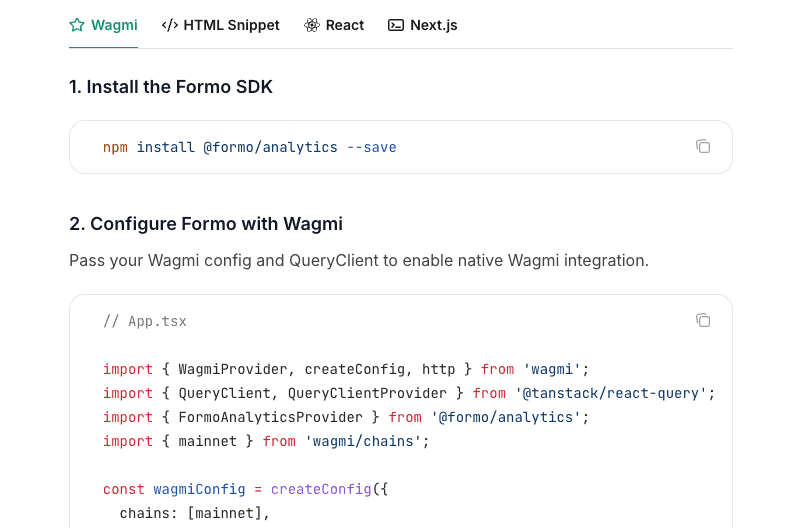 You can now install Formo with the new wagmi integration. This is now the recommended way to set up Formo for your crypto app.