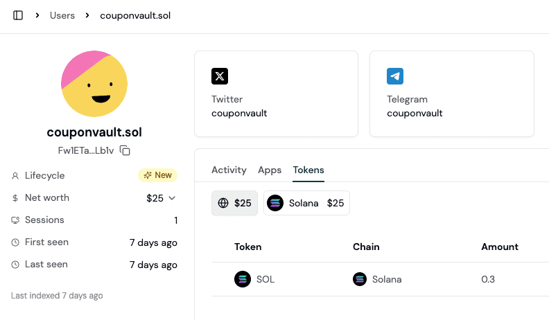 Turn anonymous Solana addresses into actionable rich profiles, with social data and token balances.