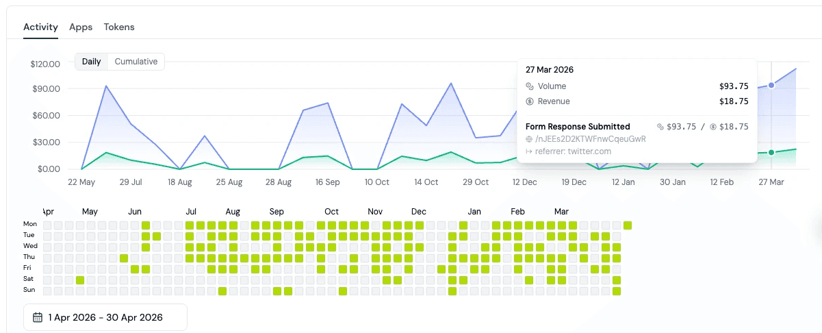 You can see how your users' volume and revenue changes across time with a new volume and revenue timeseries chart on the profile page. The chart shows full attribution of which events, referrers, UTMs, and referrals contributed to volume and revenue.