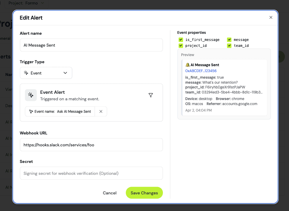 You can also customize which event properties are displayed in each alert with a live preview.