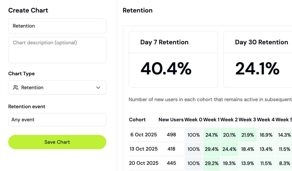 To get started, create a chart with type 'Retention' and save it to your dashboard.