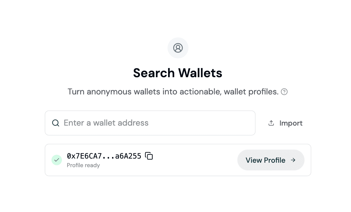 The new Search page under Explore lets you look up any wallet by address. If a wallet hasn't been profiled yet, Formo will automatically trigger on-demand profiling that returns results in less than a minute. Use this to enrich lead lists and target prospective users.